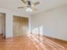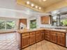 The primary suite opens to the rear yard through French doors and features a bath finished in hand-painted Spanish tile with an arched tub-shower and rustic details. The hall bath offers dual sinks, tiled tub-shower and a skylight that fills the space with natural light.