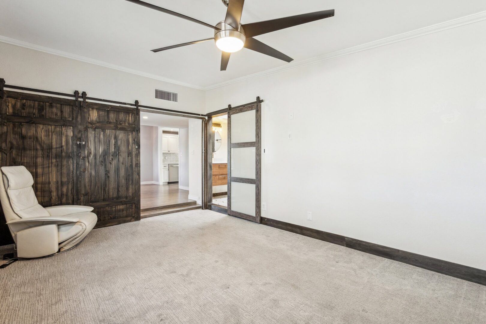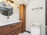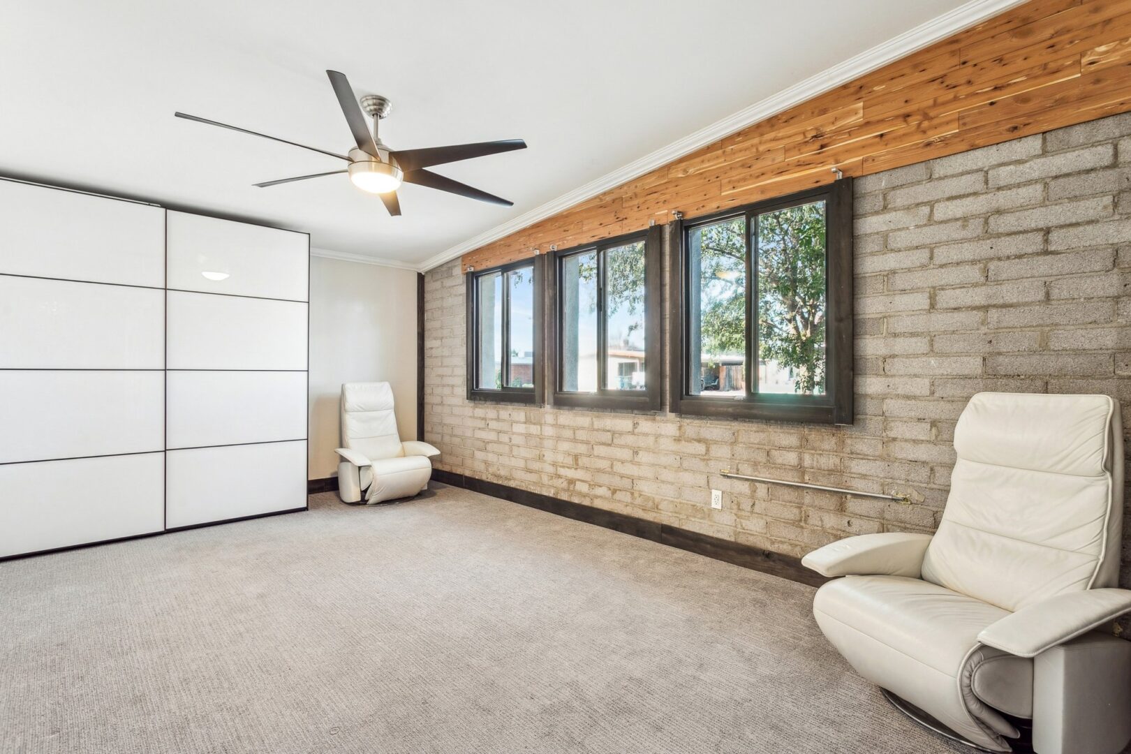 The home offers 4 comfortable bedrooms and 2 bathrooms, each finished with a modern, timeless sensibility. Looking for a split primary suite that welcomes peaceful rest and relaxation?! The newly-created primary suite (once a living space) is a true retreat with vaulted ceilings, plush carpet, ceiling fan, European-style wardrobe and gorgeous natural light from 3 dual pane windows that are set on the cedar wood + exposed block accent wall. The primary bath continues the refined aesthetic with a slate tiled shower + jetted tub with frameless glass enclosure, hexagon tiled floors, electric toilet bidet, floating vanity with extended cabinetry, skylight, vaulted ceiling and contemporary fixtures. The secondary rooms all feature vaulted ceilings, dual pane windows, plush carpet and ceiling fans. The hall bath is also fully-remodeled featuring a slate-tiled shower + tub with rain head + shower wand, inset product niche and frosted glass shower panel along with a skylight and floating vanity with vessel sink + smart mirror. Both bathrooms are pre-plumbed and wired to accommodate bidet installations, with hot and cold water lines and nearby electrical outlets.