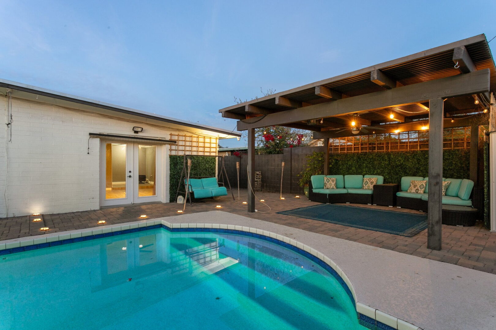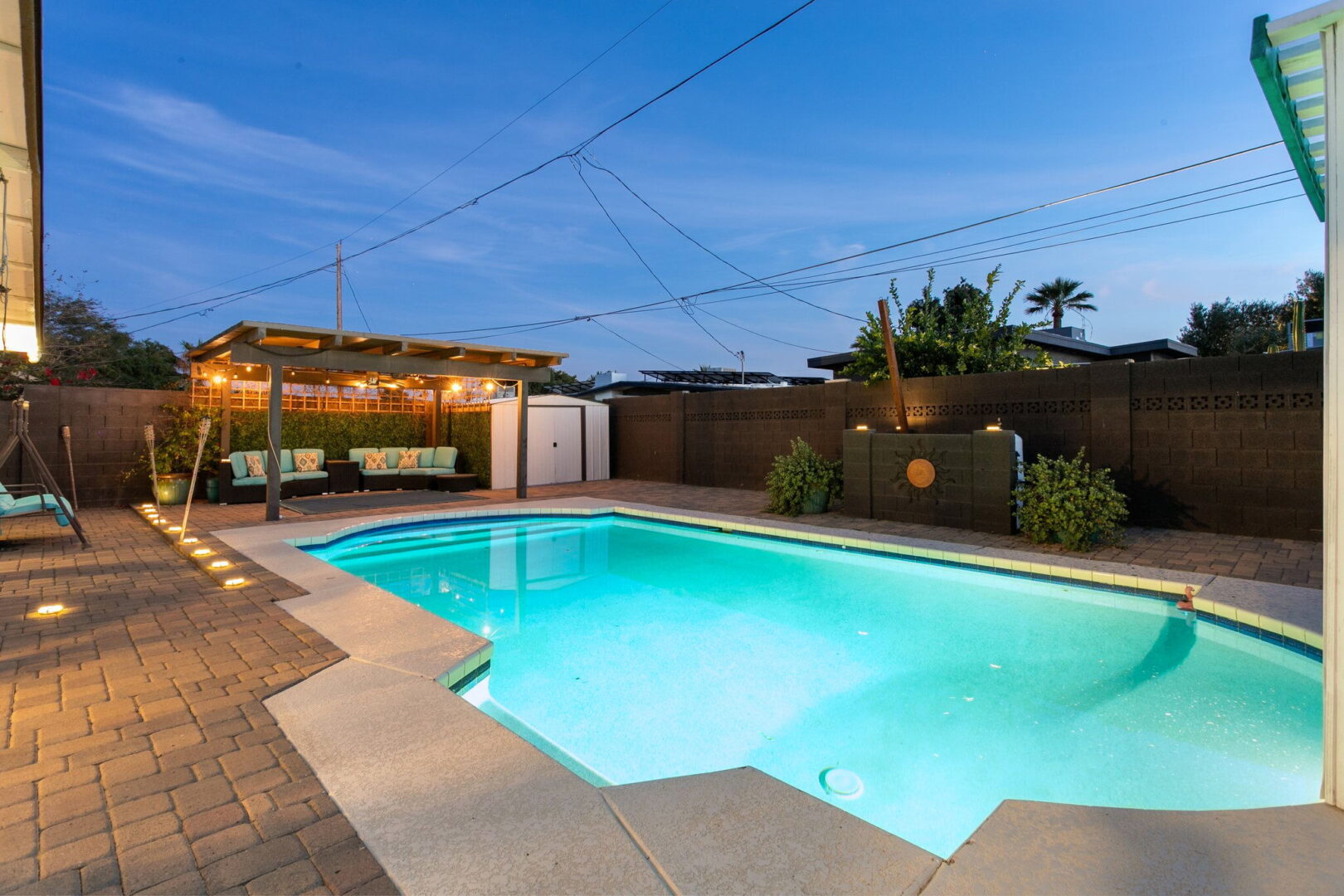 The rear yard is designed for adventure and enjoyment in every season. The sparkling pebble-finish pool takes center stage, featuring a bespoke climbing wall that adds a playful, unexpected element, while elongated entry steps invite relaxed lounging in the water. The pool equipment was upgraded in 2019. The thoughtfully composed landscape features a real grass lawn area and the privacy is enhanced by the block fencing. Expanses of pavers were installed in 2019 to extend from the poolside covered ramada to the edge of the lawn, creating a cohesive and intentional outdoor aesthetic. A discreet storage shed is tucked into the corner of the yard. Strategic lighting completes the experience, transforming the space from sunlit retreat to an inviting evening escape. The RV gate at the front of the home allows the side yard to accommodate toys, dog run or additional entertaining needs.