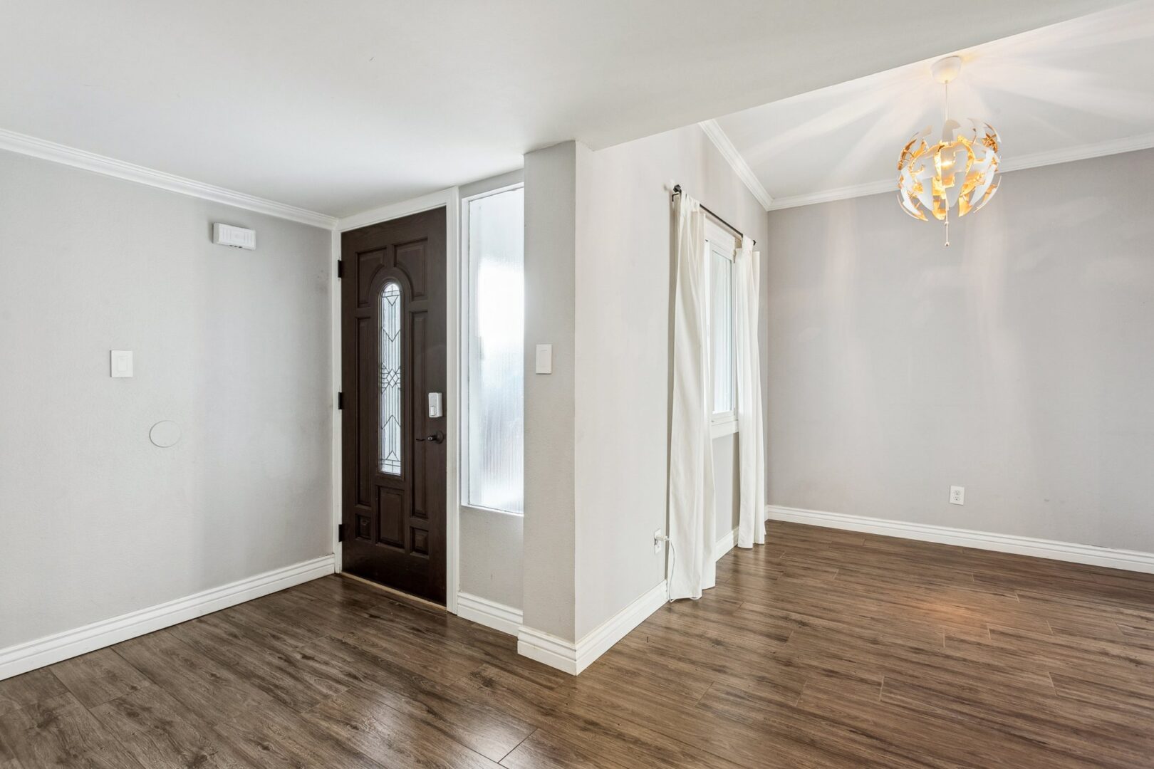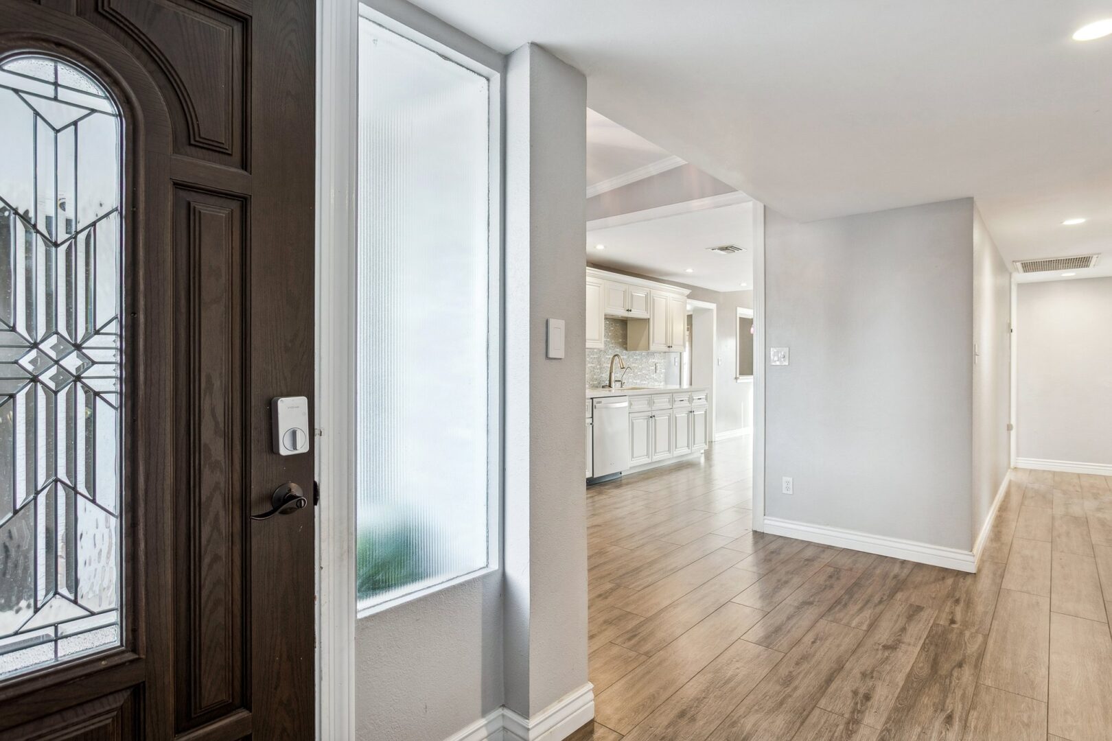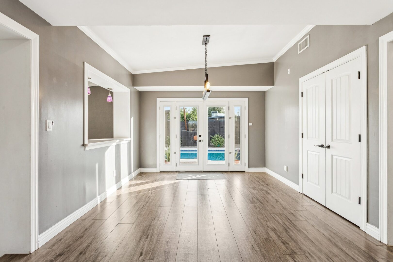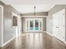 The interiors are enriched with a thoughtful blend of modern and contemporary elements paired with premium materials throughout. A gracious formal entry unfolds into expansive living and dining spaces, where durable Oak wood-look tile floors create a sense of visual continuity. The spacious living room is anchored by French doors that open seamlessly to the rear yard, inviting natural light and effortless indoor–outdoor connection.