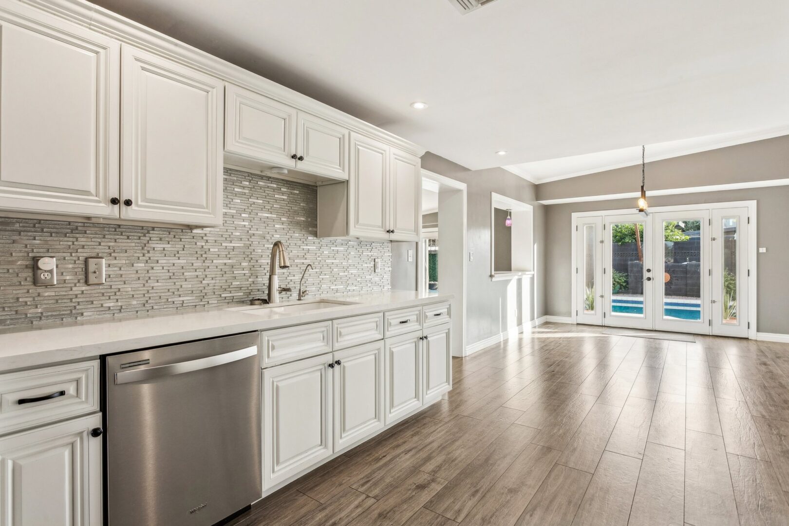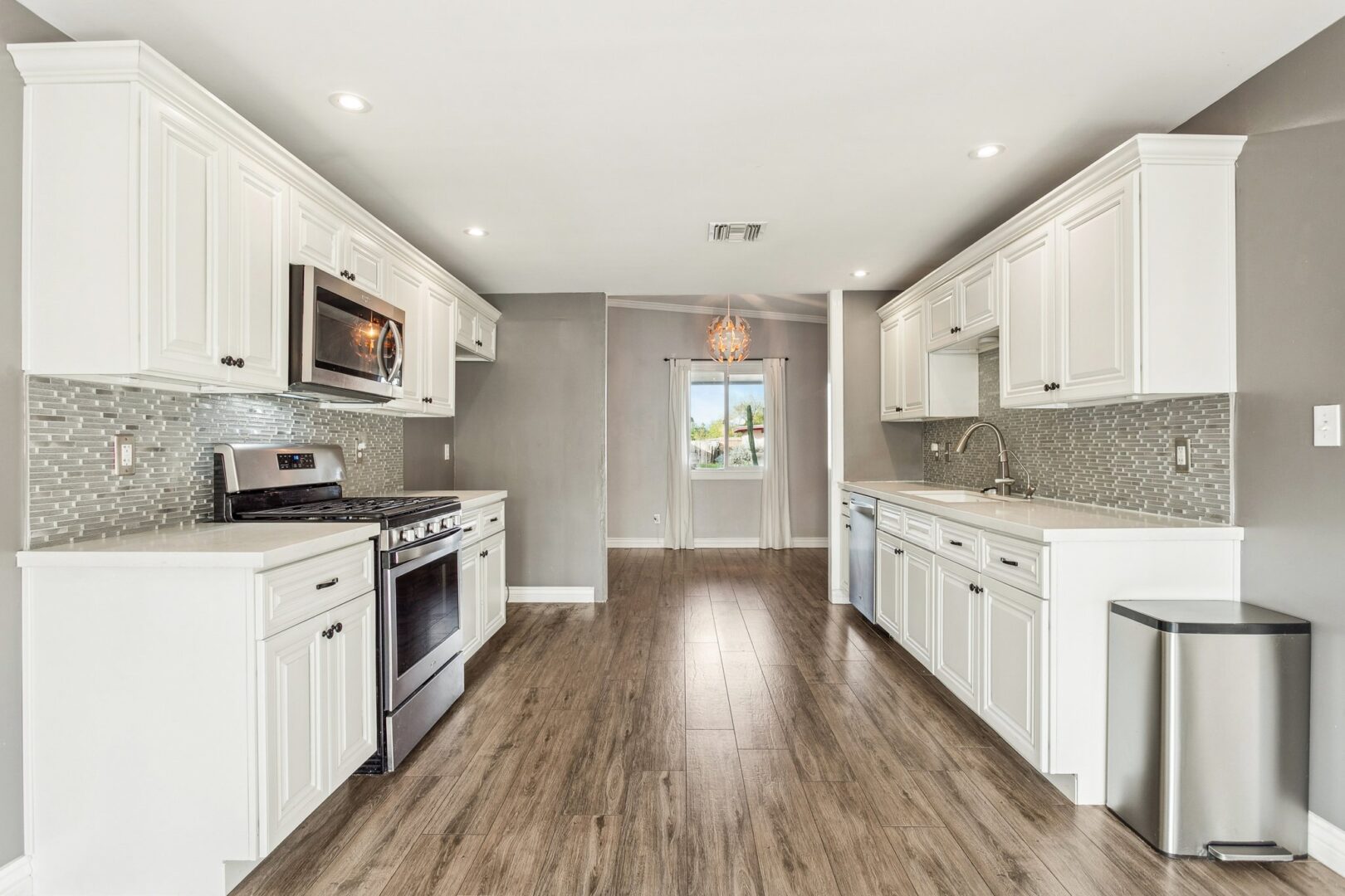 Sleek, modern finishes elevate the kitchen into a beautiful space to cook, create, and gather. Completely reimagined, it functions as both a welcoming social hub and a true culinary workspace, blending clean design with effortless practicality. Enduring finishes include classic white raised-panel cabinetry, solid quartz counters, glass tile backsplash, and stainless steel appliances featuring a gas range/oven, dishwasher and built-in microwave. A double-door pantry sits just off the kitchen and there is ample room to add a kitchen island, if desired. Entertaining is seamless with a formal dining room located adjacent to the kitchen, where French doors open directly to the rear yard. A casual dining area offers additional flexibility and can easily serve as a secondary living space.