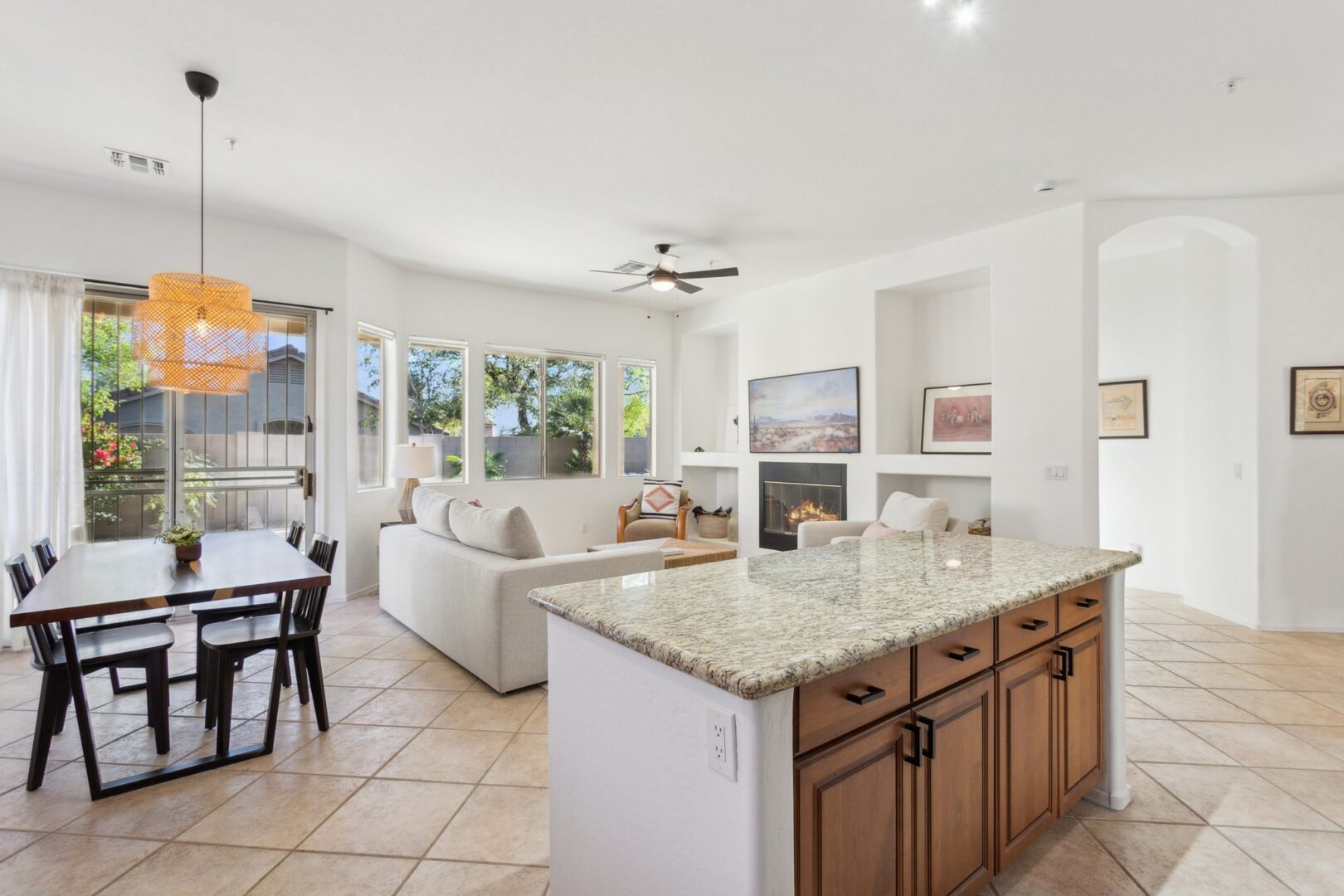 Impeccably maintained and full of upgrades, the home’s formal entry opens to a light-filled great room where ceramic tile flooring, recessed lighting and architectural niches create a clean, timeless aesthetic. A gas fireplace anchors the living space, while the open floor plan creates seamless flow between the kitchen, great room and dining room.