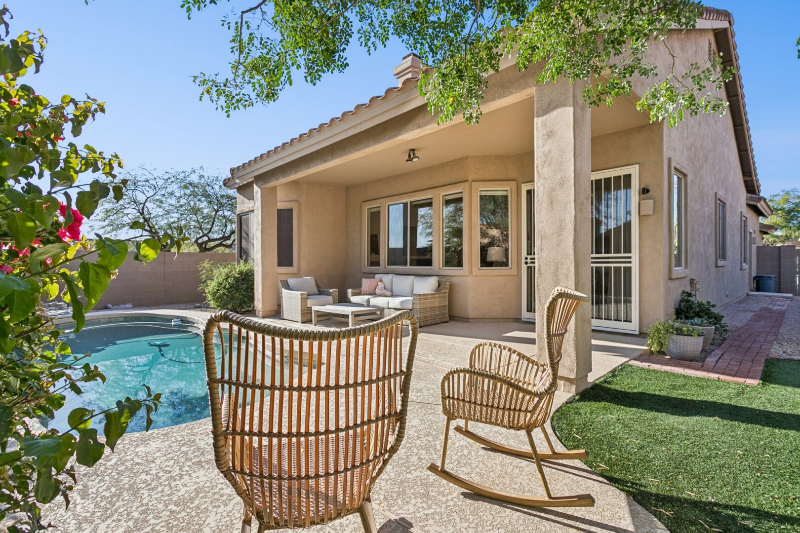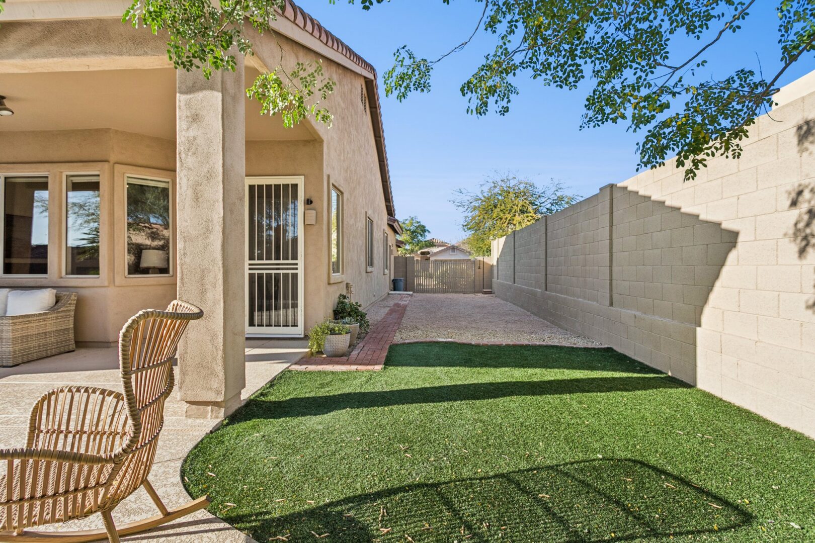 The expansive corner lot adds tangible value and utility, with a rear yard designed for year-round enjoyment. A spacious covered patio overlooks the updated Pebble Tec play pool, enhanced by newly added therapy swim jets for aqua therapy and resistance swimming (2025), all framed by brand-new cool decking (2025). Synthetic turf and desert-adapted landscaping complete the setting, creating a private, low-maintenance outdoor retreat.