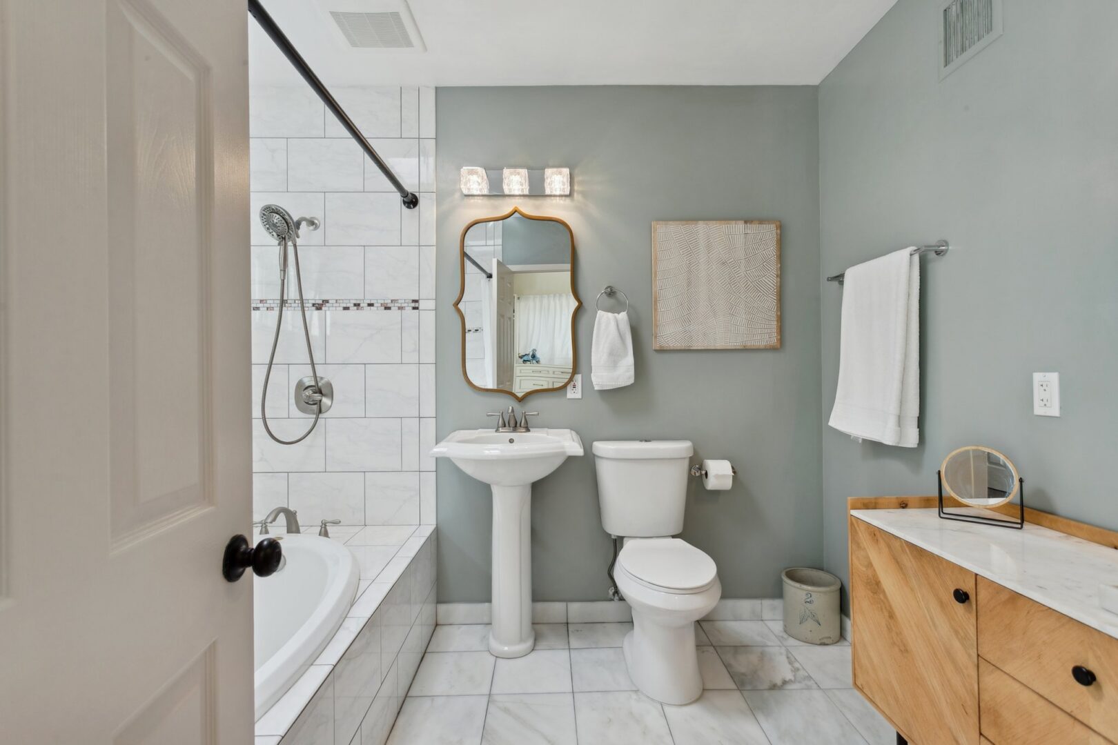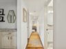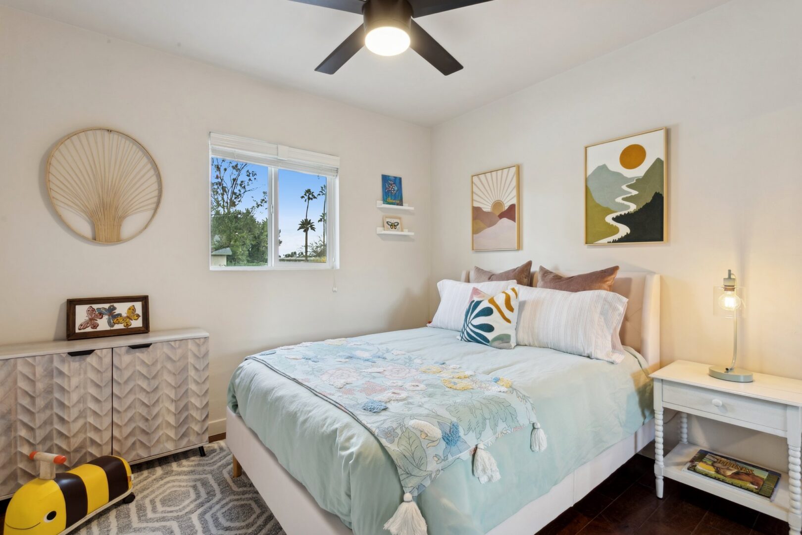 There are 3 bedrooms and 2 bathrooms. The primary suite is a retreat in scale and comfort, featuring hardwood floors, a huge walk-in closet “room” with custom, furniture-quality built-ins and French door access to the rear yard. A spa-inspired primary bath offers a tiled shower/garden tub, dual-flush toilet and super classic finishes. Secondary bedrooms maintain architectural continuity with wood floors and cohesive materials. The 2nd bedroom features beamed ceilings and hardwood floors, with a built-in credenza and generous storage room just outside the door that function as a true extension of the space. The hall bath features a walk-in, tiled shower with rain head system.