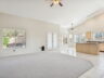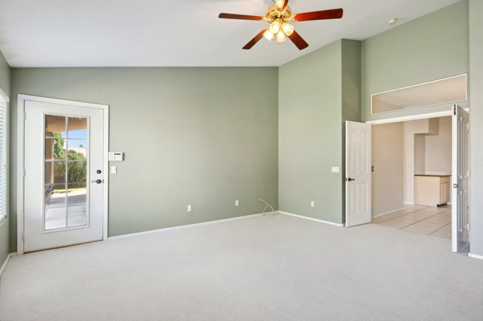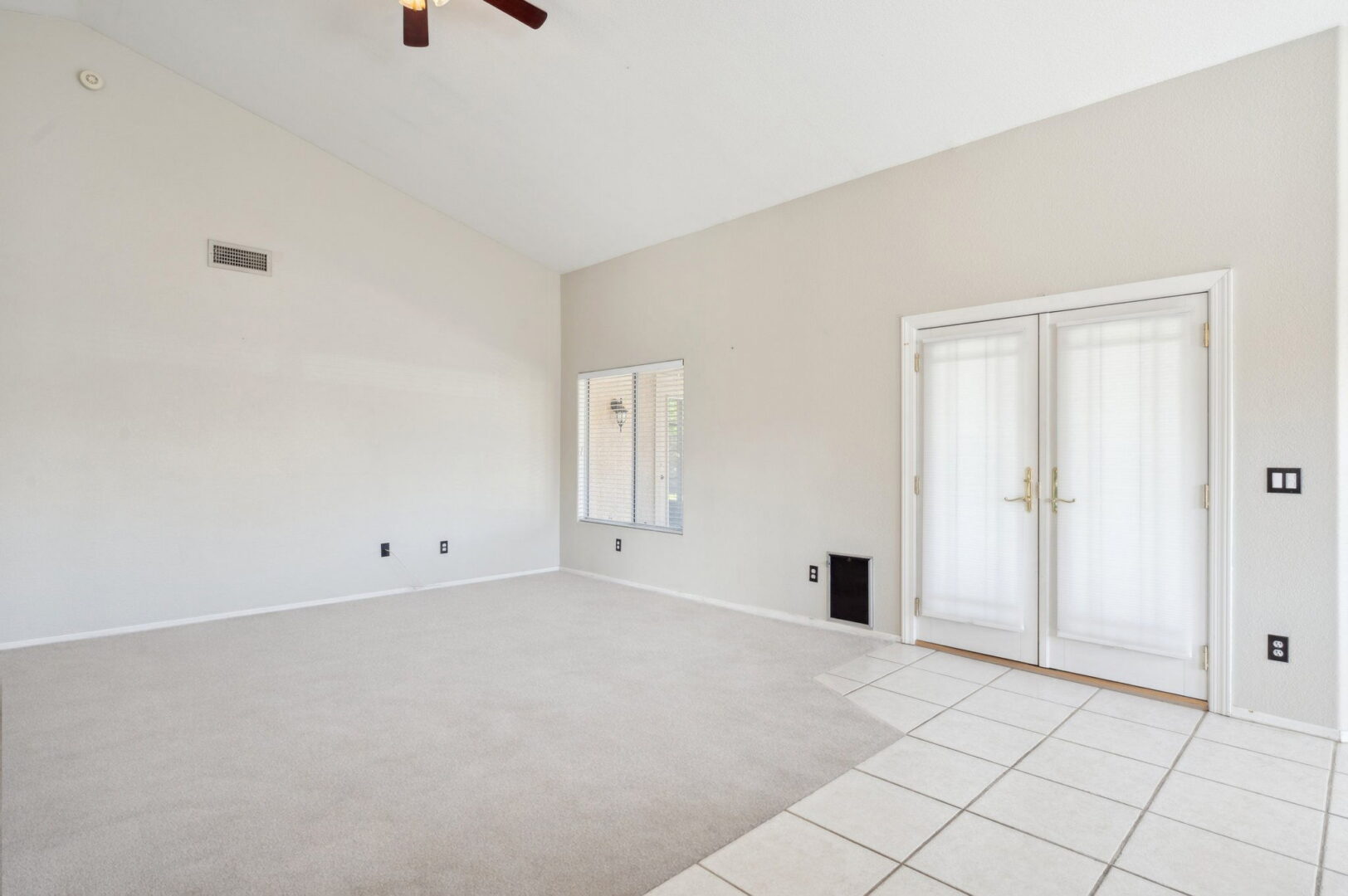 The flexible floor plan includes both a formal living room and an expansive great room, offering versatility for everyday living and entertaining. The formal living room features vaulted ceilings, plantation shutters and fresh interior paint, creating a bright and welcoming introduction to the home. The great room also showcases vaulted ceilings and opens to the rear yard through French doors, providing a seamless connection to outdoor living. Positioned directly off the kitchen, it serves as an ideal space to unwind or gather with ease.